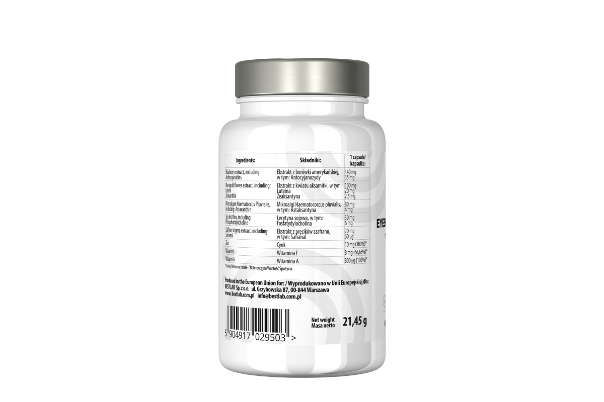 Best EyeShield zawiera wysoką dawkę luteiny i zeaksantyny, antocyjanidyny z borówki amerykańskiej, astaksantynę z mikroalg Haematococcus pluvialis, witaminę A i E, cynk, a także fosfolipidy i safranal pozyskany z pręcików szafranu.