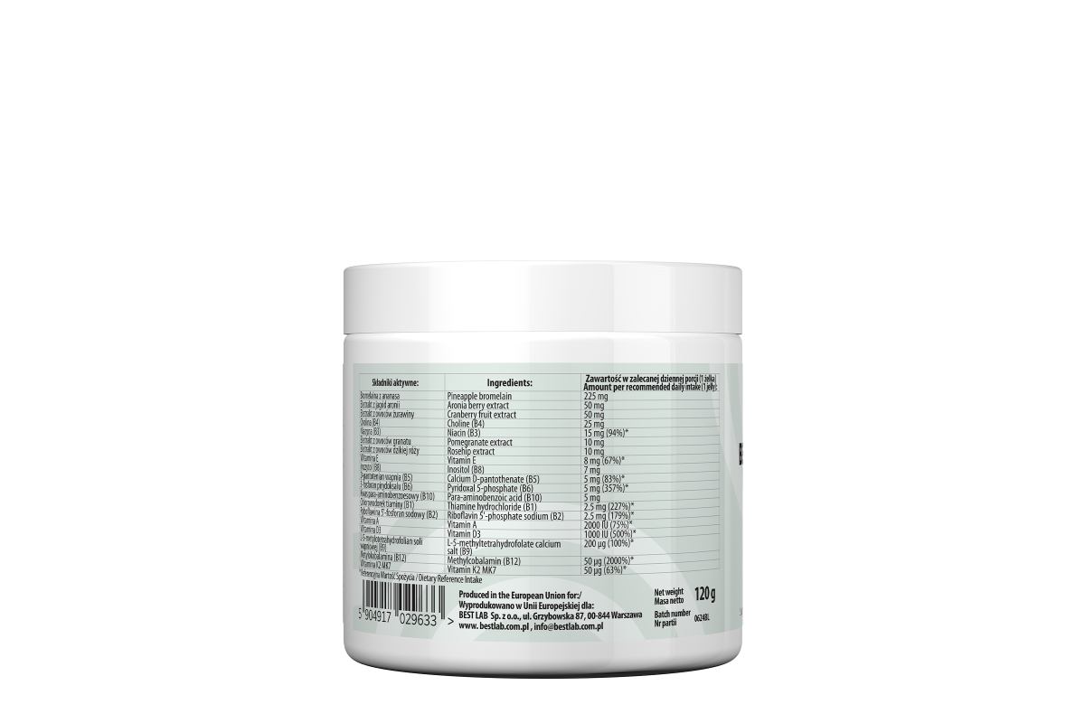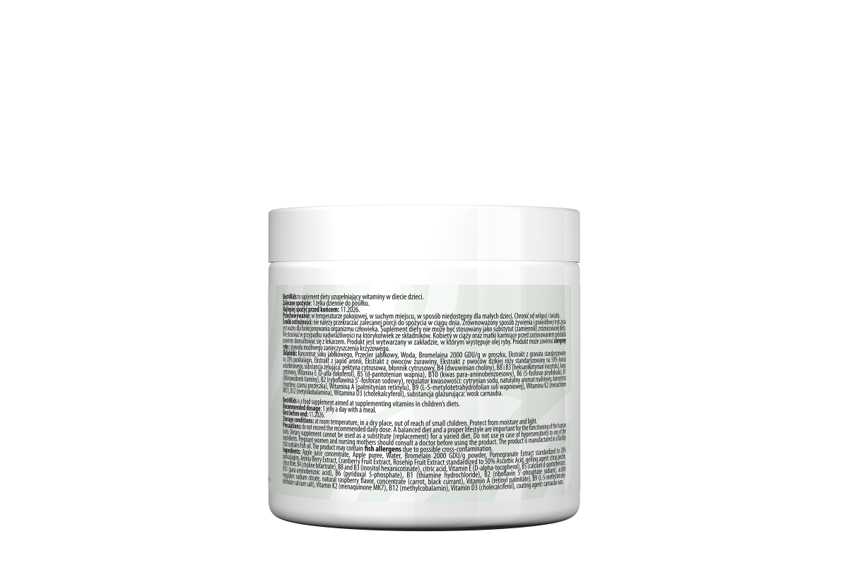 Składniki: Koncentrat soku jabłkowego, Przecier jabłkowy, Woda, Bromelaina 2000 GDU/g w proszku, Ekstrakt z granata standaryzowany na 20% punikalagin, Ekstrakt z jagód aronii, Ekstrakt z owoców żurawiny, Ekstrakt z owoców dzikiej róży standaryzowany na 50% kwasu askorbinowego, substancja żelująca: pektyna cytrusowa, błonnik cytrusowy, B4 (dwuwinian choliny), B8 i B3 (heksanikotynian inozytolu), kwas cytrynowy, Witamina E (octan DL-alfa-tokoferylu), B5 (d-pantotenian wapnia), B10 (kwas para-aminobenzoesowy), B6 (5-fosforan pirydoksalu), B1 (chlorowodorek tiaminy), B2 (ryboflawina 5’-fosforan sodowy), regulator kwasowości: cytrynian sodu, naturalny aromat malinowy, koncentrat (marchew, czarna porzeczka), Witamina A (palmitynian retinylu), B9 (L-5-metylotetrahydrofolian soli wapniowej), Witamina K2 (menachinon MK7), B12 (metylokobalamina), Witamina D3 (cholekalcyferol), substancja glazurująca: wosk carnauba.