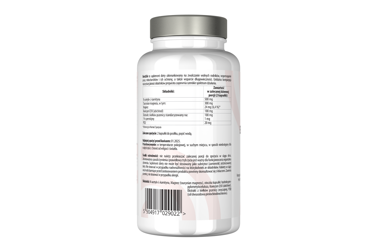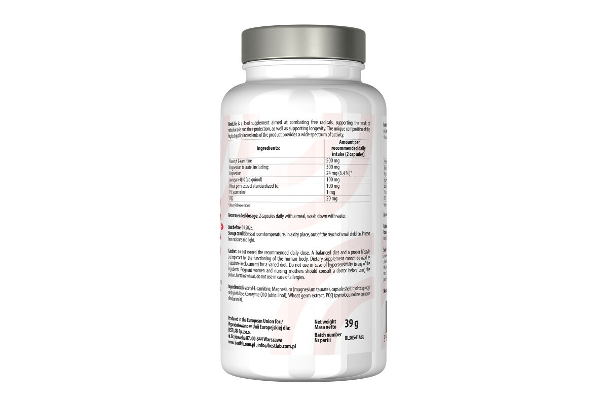 Best Life zawiera koenzym Q10, PQQ, acetylo-L-karnitynę, magnez oraz spermidynę. Połączenie naturalnych, certyfikowanych składników to gwarancja skuteczności.