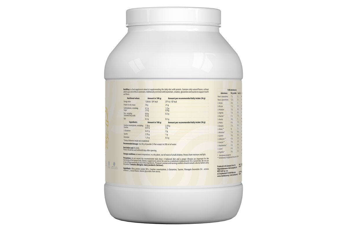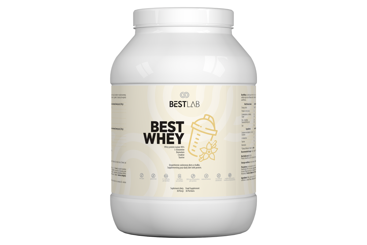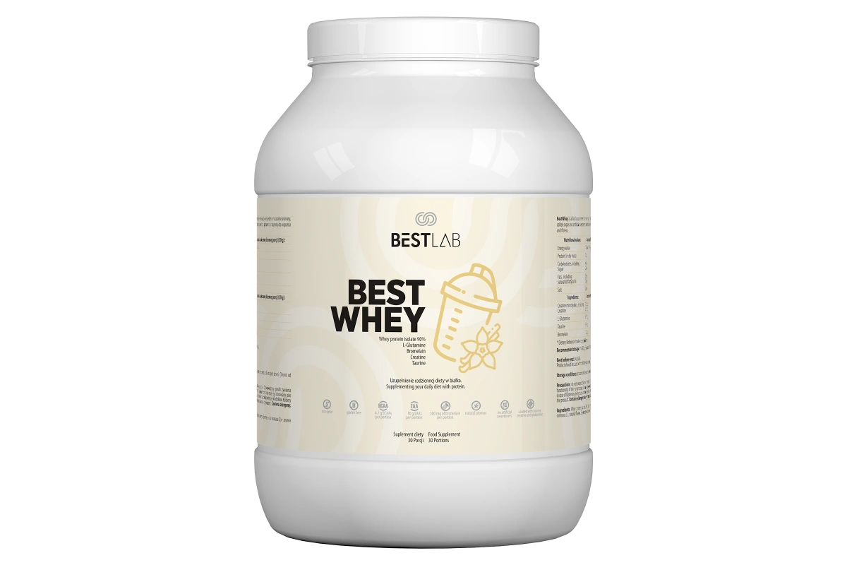 BestWhey to nowoczesny suplement diety opracowany z myślą o wsparciu budowy mięśni na każdym etapie życia. Dzięki wysokiej zawartości białka serwatkowego, monohydratu kreatyny, L-glutaminy i tauryny, składniki zawarte w BestWhey wspomagają wzrost masy mięśniowej, regenerację oraz wydolność fizyczną. Starannie dobrane składniki i naturalny smak bez sztucznych aromatów sprawiają, że produkt jest doskonałym wyborem zarówno dla osób aktywnych fizycznie, jak i dla tych, którzy chcą uzupełnić niedobory białka w diecie.