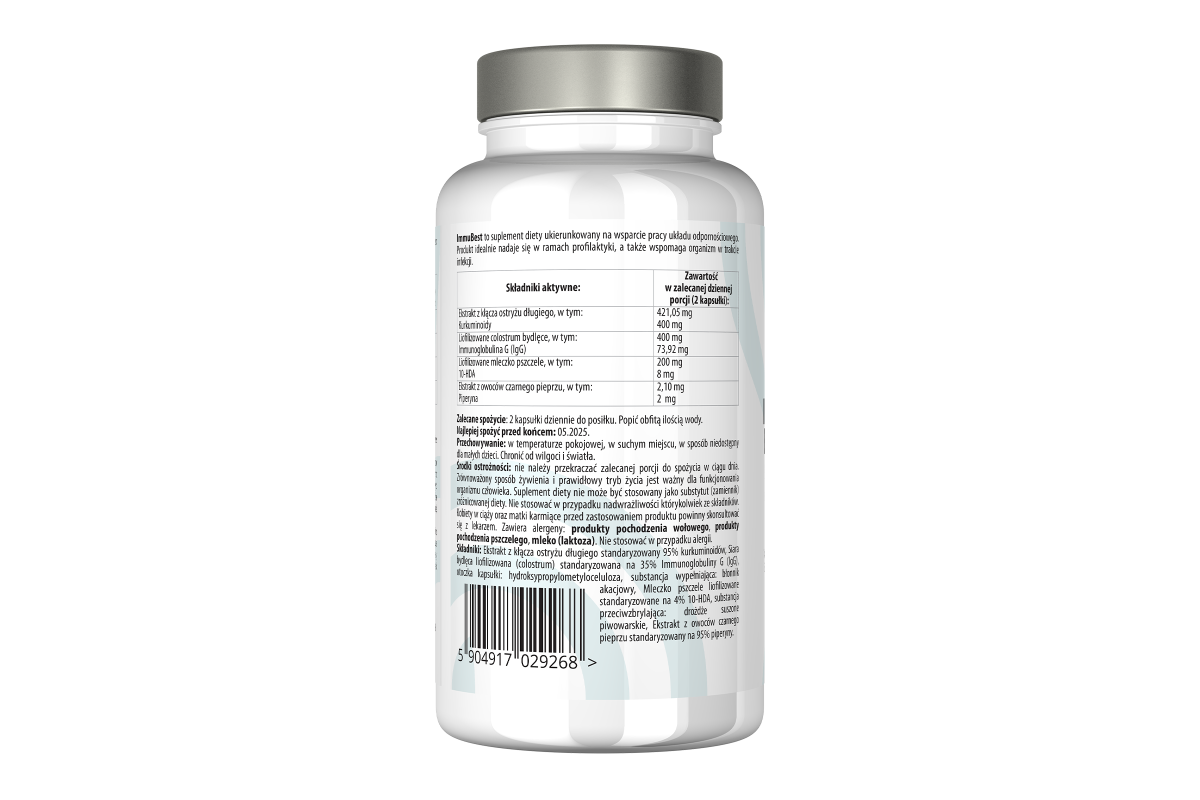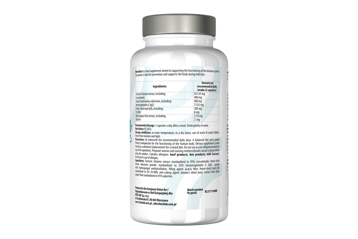ImmuBest zawiera liofilizowane colostrum bydlęce, ekstrakt z kłącza kurkumy, liofilozowane mleczko pszczele oraz ekstrakt z pieprzu czarnego dla zapewnienia synergicznego działania składników zawartych w formule produktu.